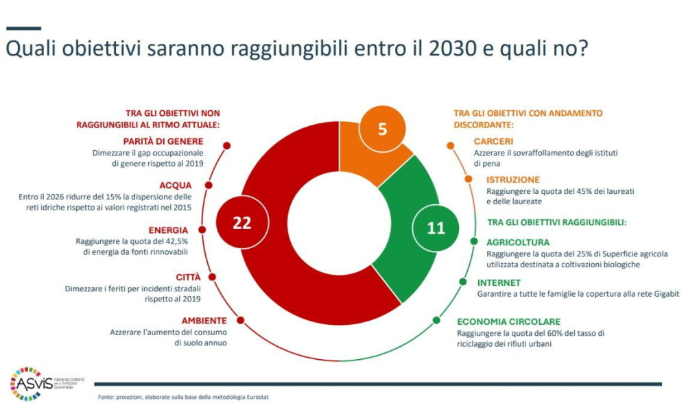 Secondo il decimo Rapporto dell’Alleanza Italiana per lo Sviluppo Sostenibile (ASviS) intitolato “L’Italia e gli Obiettivi di Sviluppo Sostenibile”, rispetto al 2010, gli indici relativi all’Italia mostrano un peggioramento per sei obiettivi (sconfiggere la povertà; acqua pulita e servizi igienicosanitari; ridurre le disuguaglianze; vita sulla Terra; pace, giustizia e istituzioni solide; partnership) su 17, una situazione stazionaria per altri quattro (sconfiggere la fame; salute e benessere; imprese, innovazione e infrastrutture; città e comunità sostenibili) e un aumento solo per tre, particolarmente elevato per l’economia circolare.
